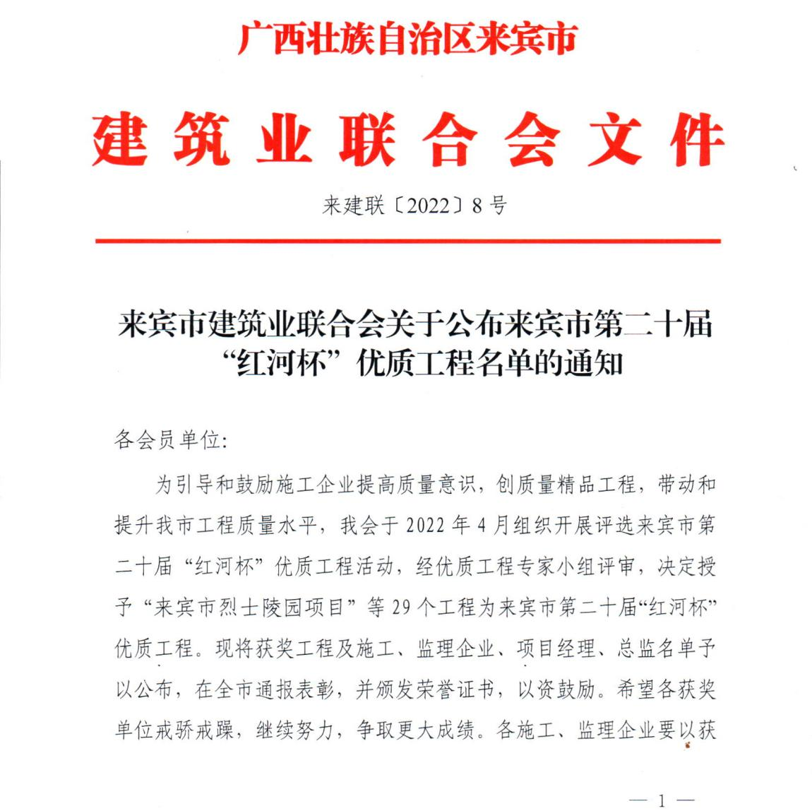 5月10日,来宾市建筑业联合会印发《关于公布来宾市第二十届“红河杯”优质工程名单的通知》,开云集团有限公司承建的来宾市烈士陵园项目、裕达•裕嘉园5#楼(不含地下室)、裕达•翡翠园3#楼(不含地下室)等共8个项目荣获来宾市第二十届“红河杯”优质工程奖。