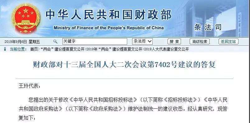 9月3日,财政部网站发布《财政部对十三届全国人大二次会议第7402号建议的答复》,披露了财政部对全国人大代表王玲提出的关于修改《中华人民共和国招标投标法》、《中华人民共和国政府采购法》维护法制统一的建议的答复内容。
