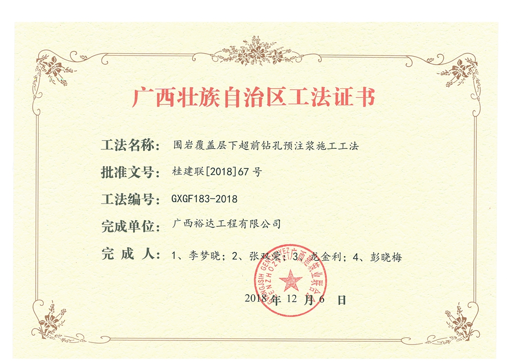 2018年广西壮族自治区工法证书(围岩覆盖层下超前钻孔预注浆施工工法)