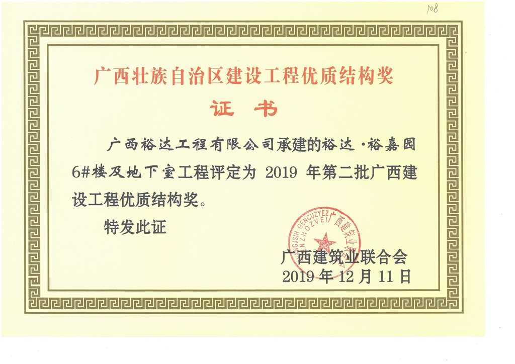 裕达·裕嘉园6#楼及地下室工程评定为2019年第二批广西建设工程优质结构奖